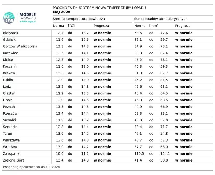 Według wstępnych prognoz Instytutu Meteorologii i Gospodarki Wodnej (IMGW) na maj, na terenie całego kraju zarówno średnia temperatura powietrza, jak i suma opadów najprawdopodobniej zmieszczą się w normie wieloletniej (z lat 1991-2020). Oznacza to raczej umiarkowaną pogodę, bez upałów, ale też bez wyraźnych anomalii chłodu.