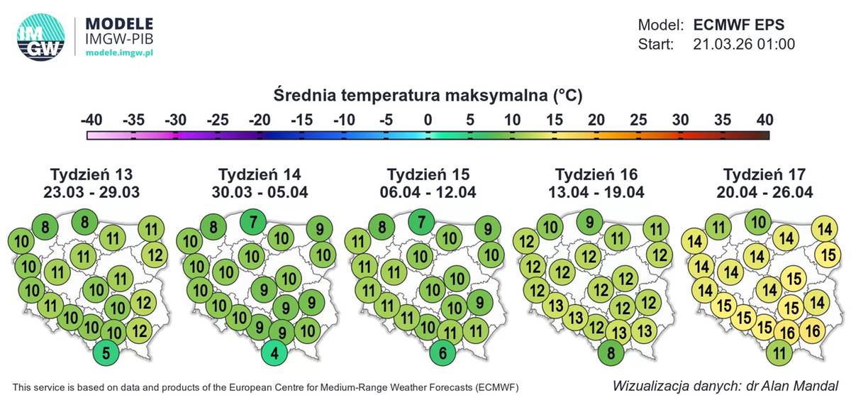 Z wyliczeń wynika, że pod koniec kwietnia na przeważającym obszarze kraju średnia temperatura maksymalna wyniesie około 14-15 st. C. Najcieplej zapowiada się w Małopolsce i na Podkarpaciu (do 16 st. C), a najchłodniej w Trójmieście, Koszalinie i na Podhalu (10-11 st. C).