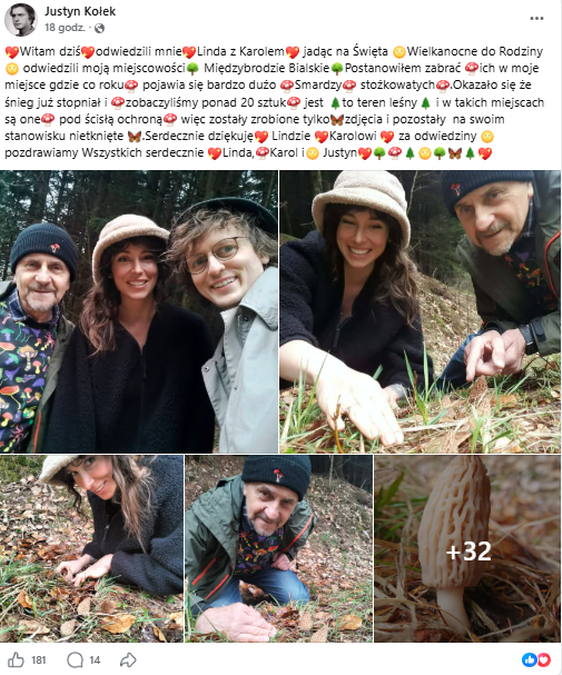 Justyn Kołek Facebook- Odwiedzili mnie Linda z Karolem, jadąc na Święta Wielkanocne do Rodziny odwiedzili moją miejscowości Międzybrodzie Bialskie. Postanowiłem zabrać ich w moje miejsce, gdzie co roku pojawia się bardzo dużo Smardzy stożkowatych. Okazało się, że śnieg już stopniał i zobaczyliśmy ponad 20 sztuk - poinformował grzyboznawca.
