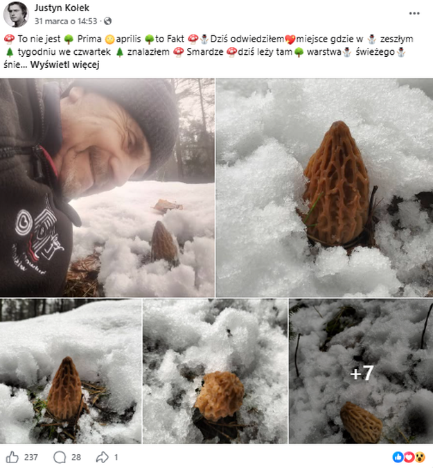 Z kolei znany grzyboznawca i autor książek o grzybach - Justyn Kołek - poinformował w mediach społecznościowych, że natknął się na smardze wystające spod cienkiej warstwy świeżego śniegu.