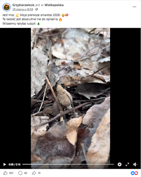 Twórca "Grzybiarzwlesie" na swoim profilu na Facebooku pod koniec marca opublikował wideo, na którym poinformował, że po raz pierwszy w tym roku natknął się na te przysmaki.