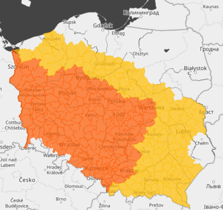 Po południu IMGW rozszerzył ostrzeżenia na województwa: małopolskie, podlaskie, świętokrzyskie i znaczną część województw lubelskiego, mazowieckiego, kujawsko-pomorskiego oraz zachodniopomorskiego.